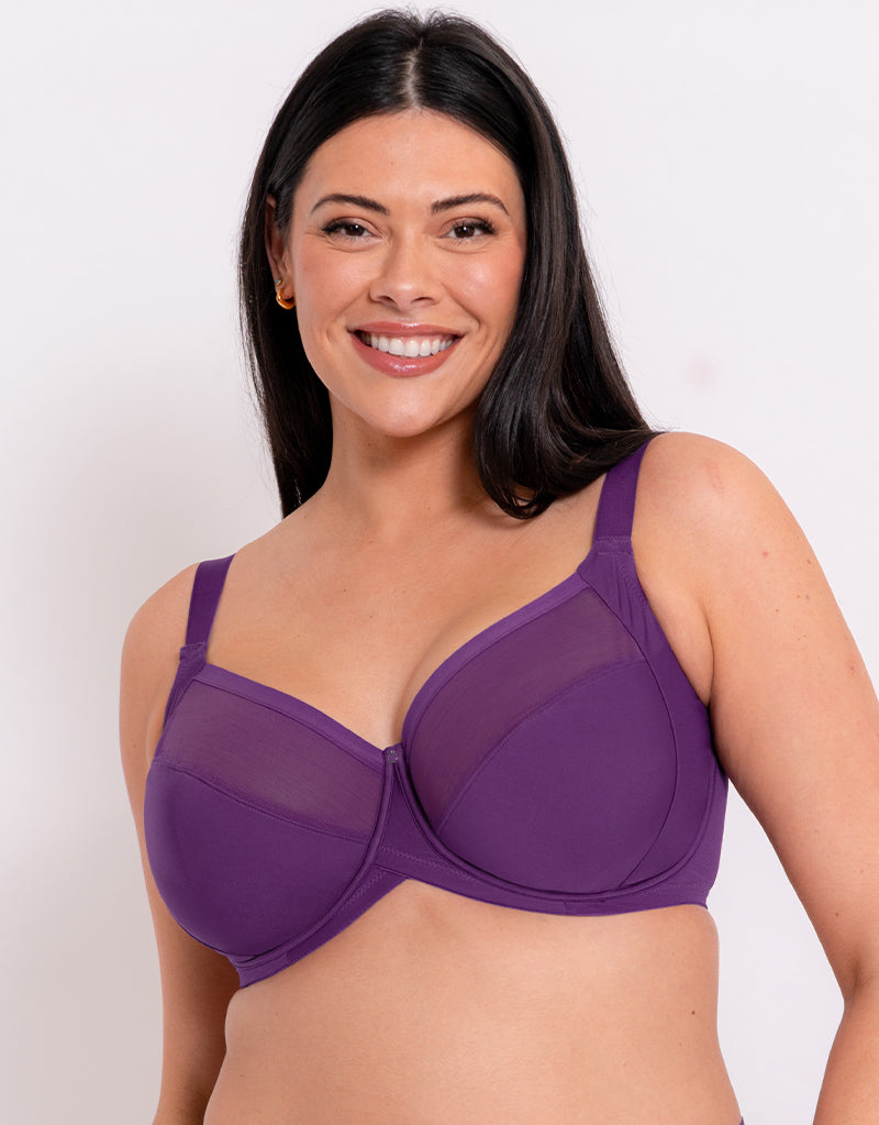 This Balcony Bra is packed with fancy features and comes in fashion colors (Black Floral, Forest Green, Purple) for a touch of style. Comfort is key, with stretchy mesh panels on top of the smooth microfiber cups for a flexible fit. And worry no more about slipping straps with the securely anchored back straps, and a curved underband to prevent any discomfort or roll.
