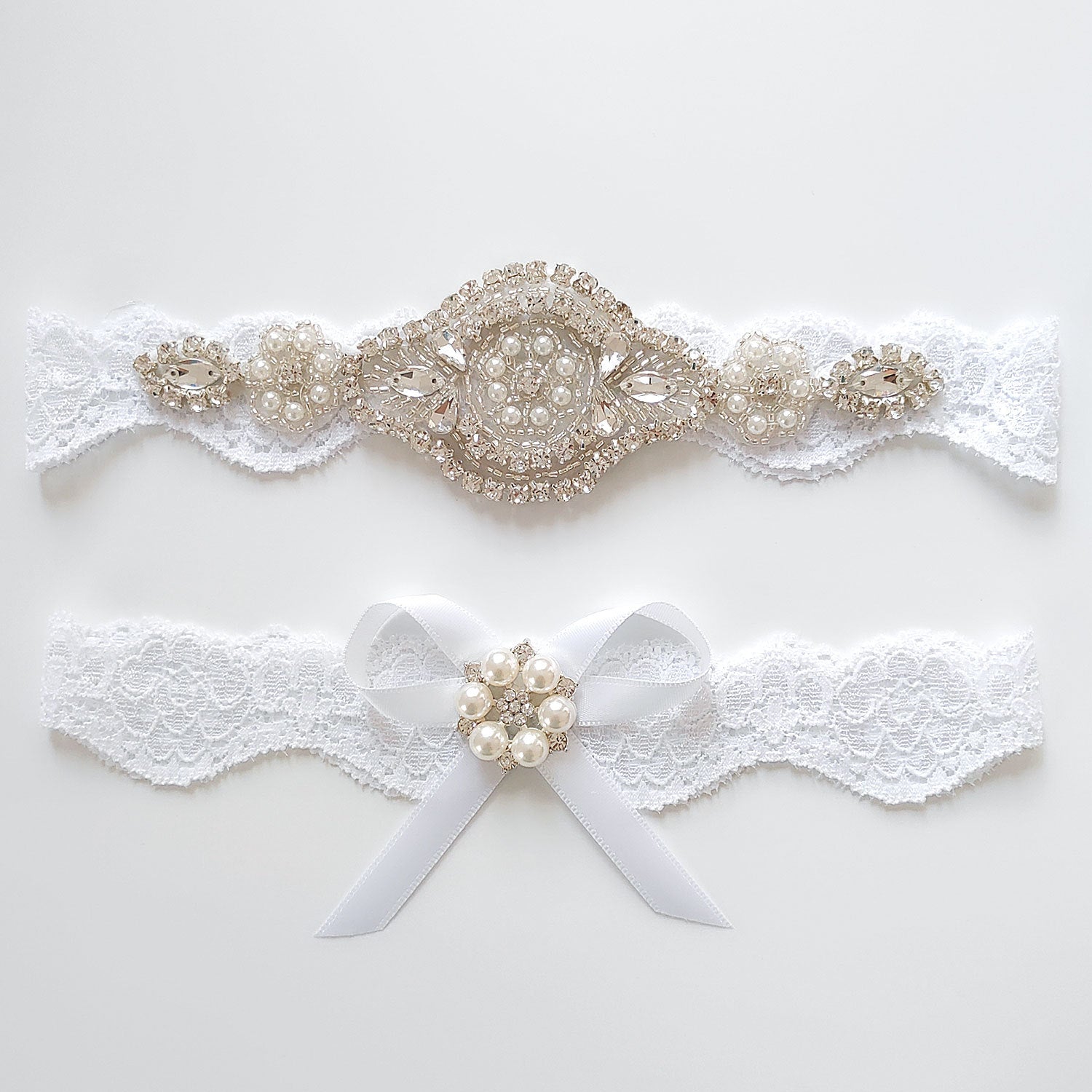 Add a touch of sparkle to your big day with this White Lace & Rhinestone Wedding Garter Set. Each garter features hand-beaded pearls and intricate rhinestone detailing on a soft, stretchy organza band for a perfect, comfortable fit.