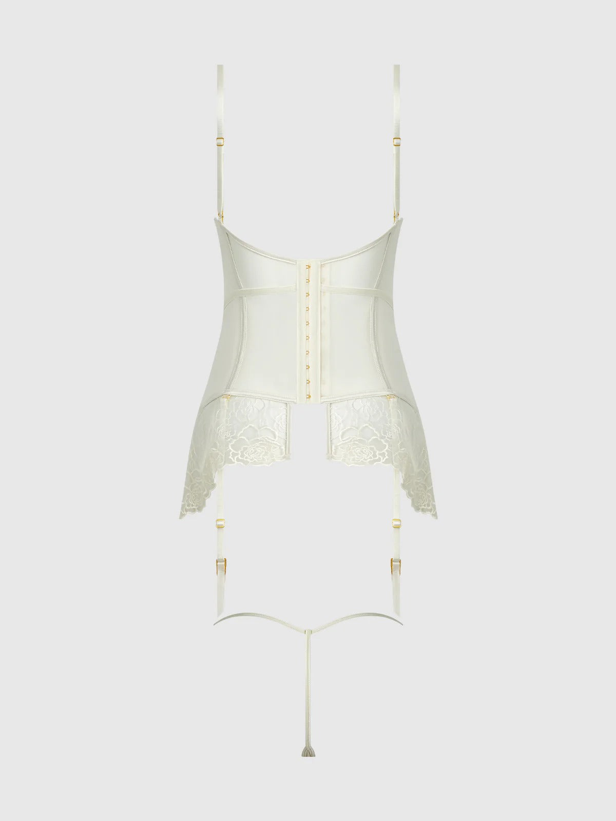 - Lace hem panel with open-back design.