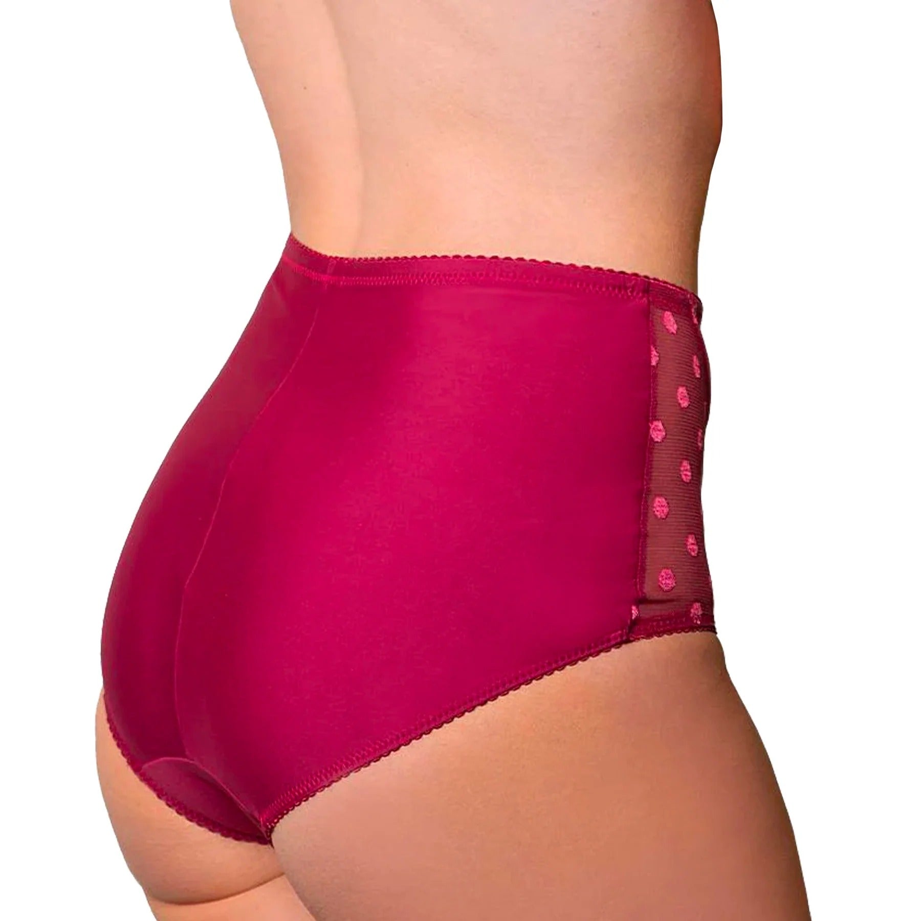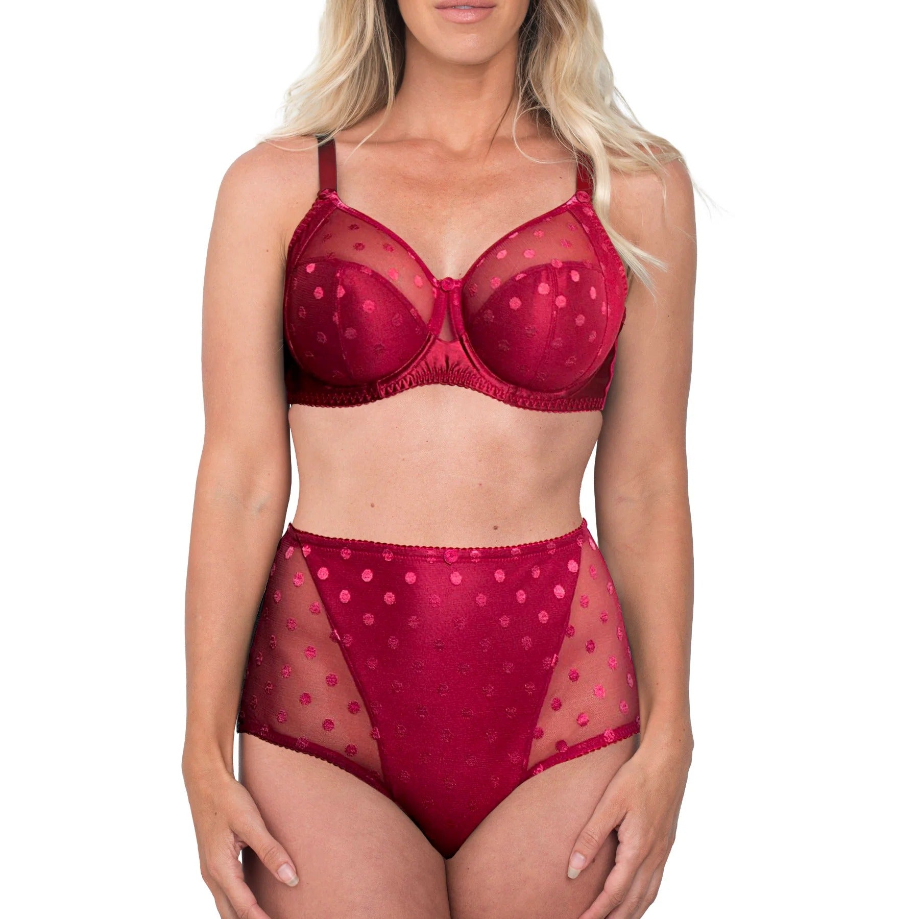 The CARMEN Brief from Fit Fully Yours has lustrous lace detailing that creates a feminine and sophisticated look. This stylish, fun, high rise brief combines pretty polka dot fabric with power mesh. The result is great fit with great coverage. Pair it with the Carmen Full-Coverage Underwire Bra for a sexy and beautiful look.