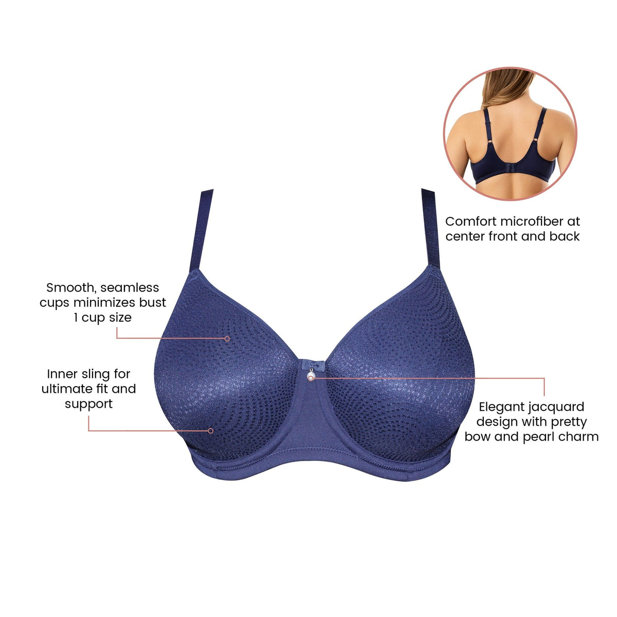 The Parfait Pearl Non-padded Seamless Minimizer Bra showcases an elegant jacquard fabric that enhances its seamless design. Its smooth, double-lined molded cups without padding include internal side slings to reduce the bust by up to one cup size. The microfiber at the center front and back ensures exceptional comfort in this stylish bra.