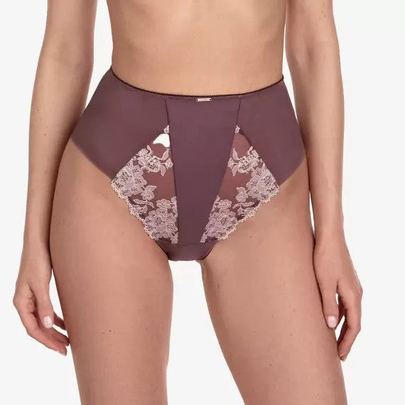 Exquisite high rise mocha slips make up the Ajour Full Brief. Made of translucent mesh. The front is decorated with embroidery and smooth elastic fabric. With a cotton gusset.
