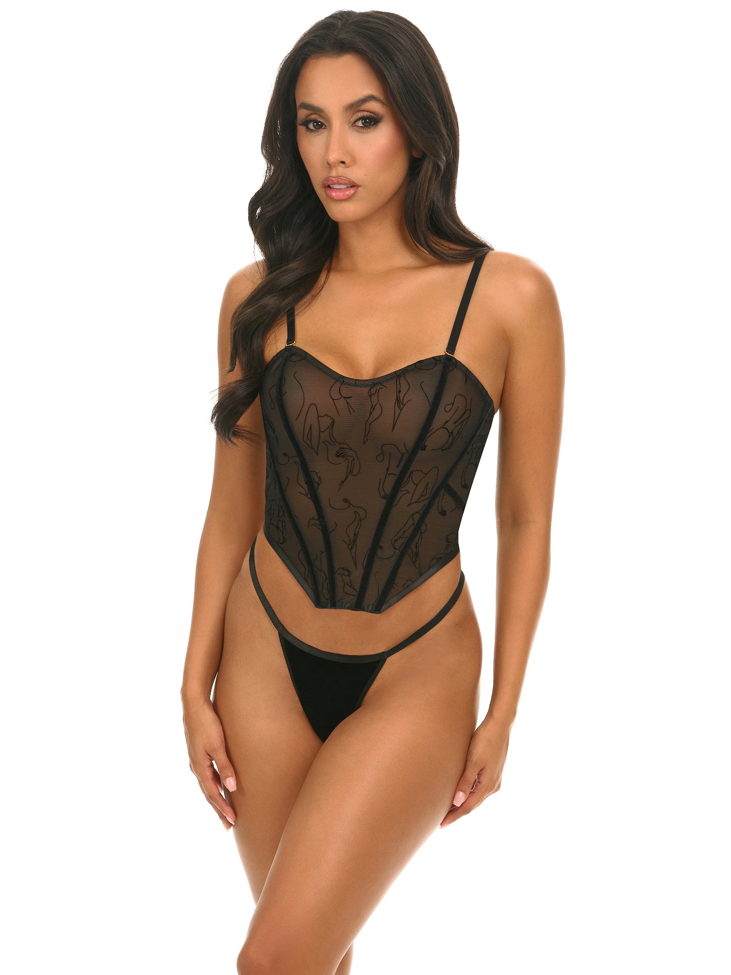 Indulge in opulent sophistication with the Paris Bustier Set, a breathtaking fusion of artistry and allure. This exquisite set features a burnout mesh bodice adorned with hand-drawn velvet flocking, creating a rich, textured design that feels as luxurious as it looks.